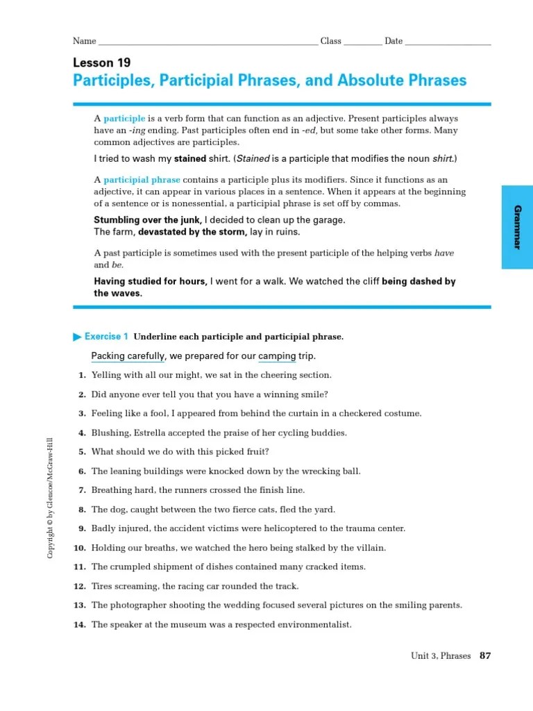 The hummingbird, flitting quickly from flower to flower, . Participles can also be present in groups of words (phrases). Questions address participles as a part of speech and the correct use of a participle in a sentence. A participial phrase is made up of a participle and its modifiers and complements; Participles very often act as an adjective and nouns in sentences. · (drink) one litre of water, she really needed to go to the toilet. The wrecked car was totaled. · (leave) the party too early, . Welcome back · english classroom website · about me · contact me · the legend of sleepy hollow · quiz star . Participles and participial phrases must be placed as close to . A participial phrase consists of a participle plus modifier(s), object(s), and/or complement(s). Underline the participial phrase in each of the sentences. Exercises · (park) the car, we searched for the ticket machine.
